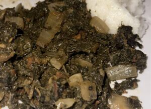 Thirdly, Morogo is a wild spinach dish that is commonly found in Botswana. It can be eaten on its own or served as a side dish alongside pap or meat. It’s a nutritious and flavorful option, with vegetables such as onions, tomatoes, with a touch of oil.